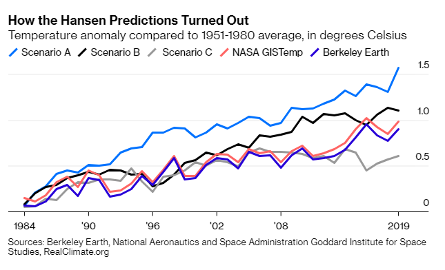 From Justin Fox, here's a look at how James Hansen's 1988 prediction of where global temperatures were headed as a result of anthropogenic global warming. Pretty damn accurate. I would snark about social science, but this is really just too scary to joke about. Source: Bloomberg.