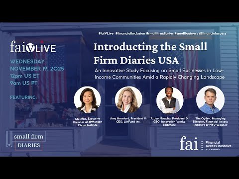 In this webinar, we introduce The Small Firm Diaries USA—a new research initiative examining the daily financial realities, challenges, and resilience strategies of small firm owners and their workers. Through a discussion with expert panelists, we explore how the shifting U.S. business landscape—from policy changes to economic pressures—is affecting the smallest employer firms in low-income areas. Panelists :Chi Mac, Executive Director at JPMorgan Chase Institute Amy Hereford, President & CEO, LiftFund Inc. A. Jay Nwachu, President & CEO, Innovation Works Baltimore. Moderator: Timothy Ogden, Managing Director, Financial Access Initiative